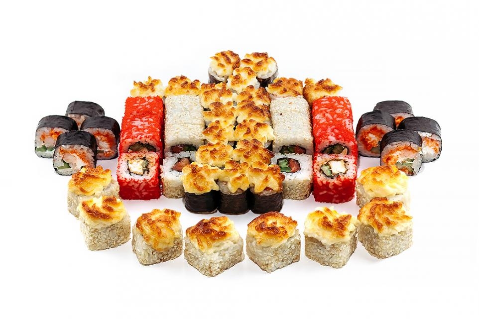 Курица копченая (Запеченный) - 6, Ролл краб запеченный классический - 6, Ролл Снежинка - 8, Окианава - 8, Ролл За всё - 8, Ролл Лосось-Огурец - 8, Ролл лосось запеченный классический - 6Ингридиенты:
