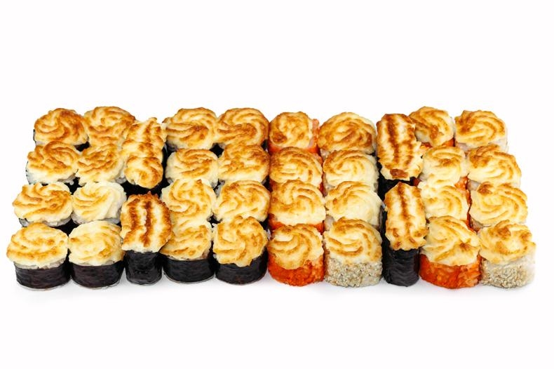 Рис, Нори, Курица, Спайси соус, Сыр моцарелла, Огурец, Сыр Буко, Лосось, Кунжут, Масаго, Майонез, Имитация краба, КреветкаТолько премиум продукты первой свежести и высшего качества