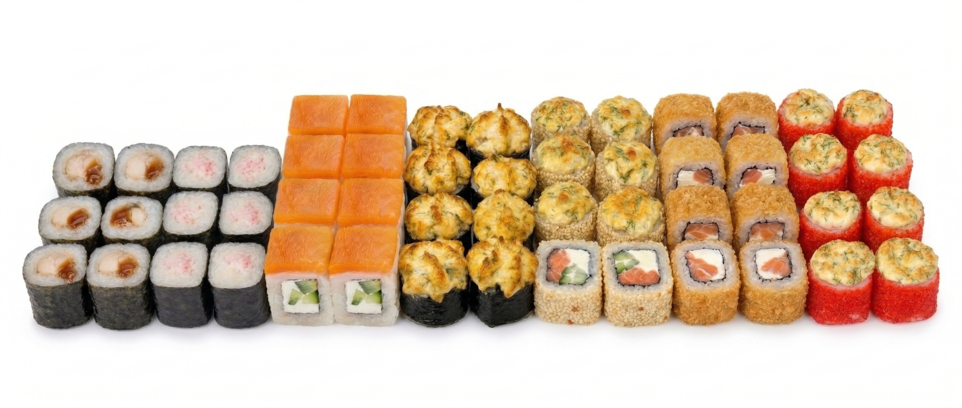 Рис, Нори, Кунжут, Краб, Сыр, Креветка, Сыр Буко, Сыр моцарелла, Огурец, Лосось, Имитация крабаТолько премиум продукты первой свежести и высшего качества
