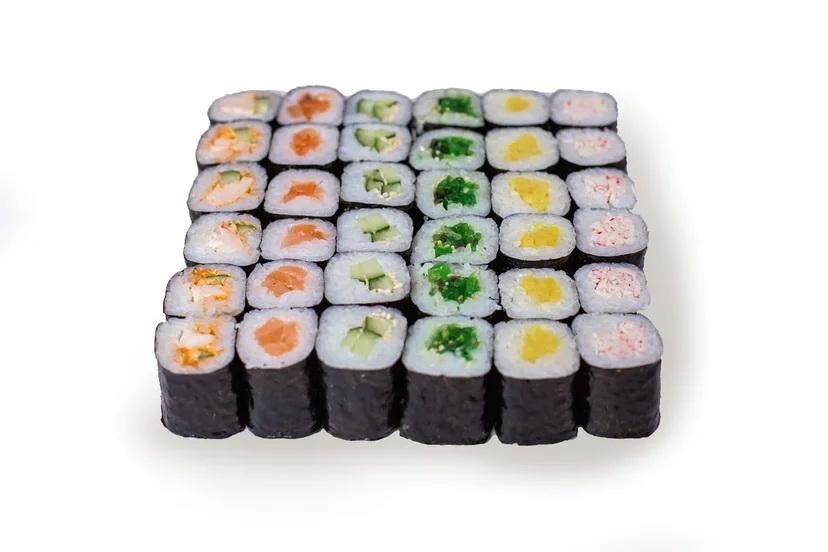 Ролл Краб - 6, Ролл Огурец - 6, Ролл Лосось - 6, Ролл Такуан - 6, Ролл Чука - 6, Ролл Копченая курица - 6Ингридиенты: