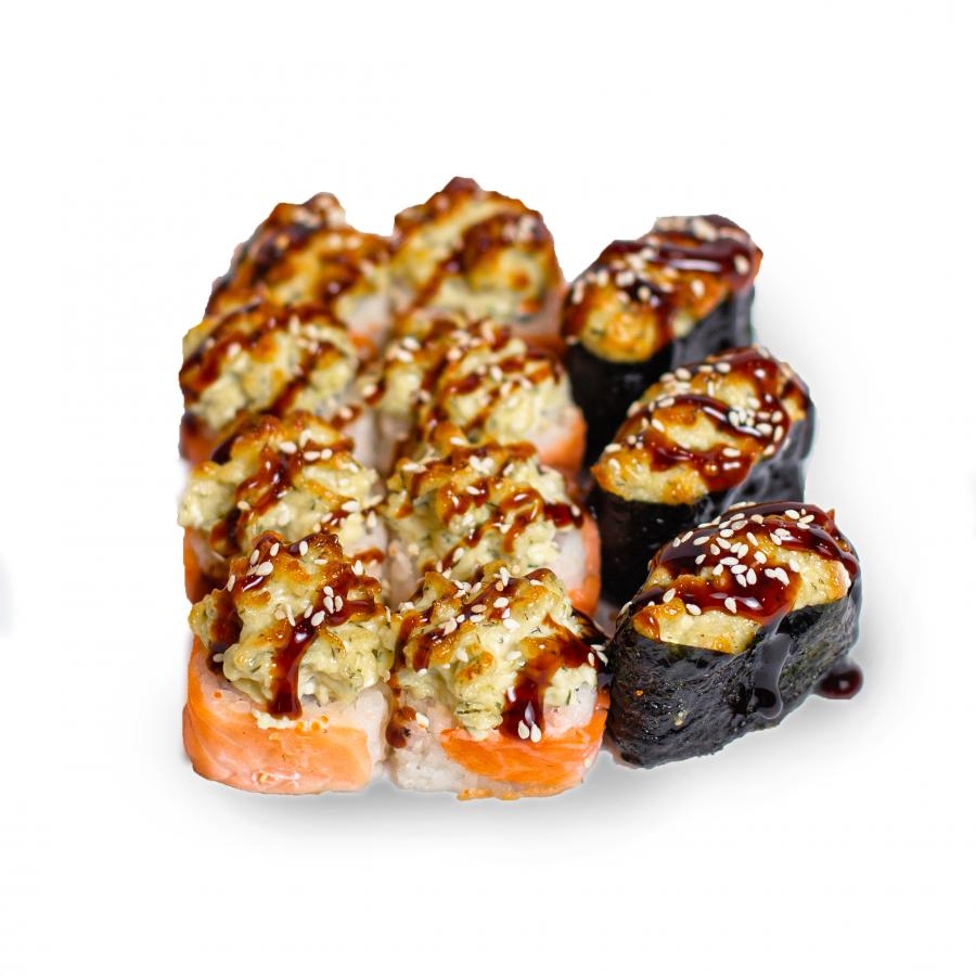 Ямайка (Запеченный) - 8, Суши Лосось - 1, Краб - 1, Суши Креветка - 1Ингридиенты: