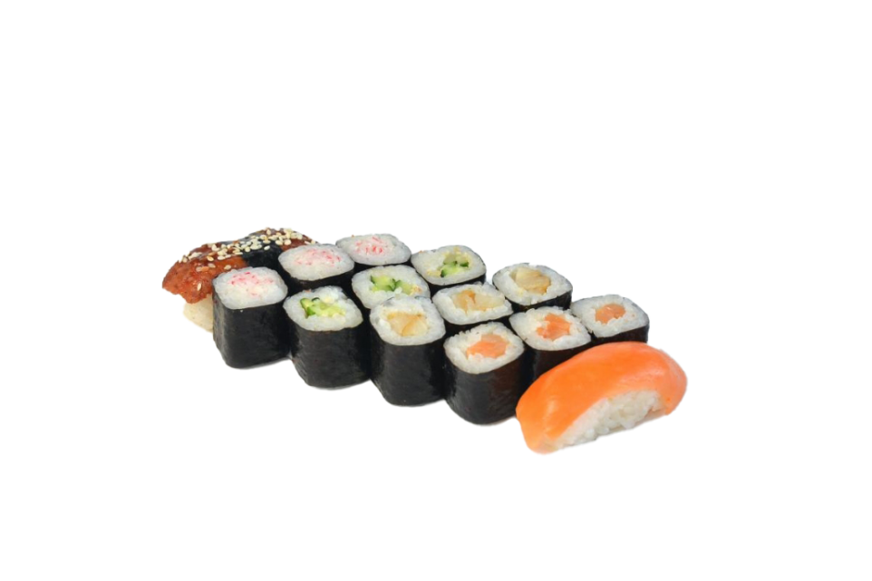 Ролл Краб - 3, Ролл Лосось - 3, Ролл Эсколар - 3, Ролл Огурец - 3, Суши Лосось - 1, Суши Угорь - 1Ингридиенты: