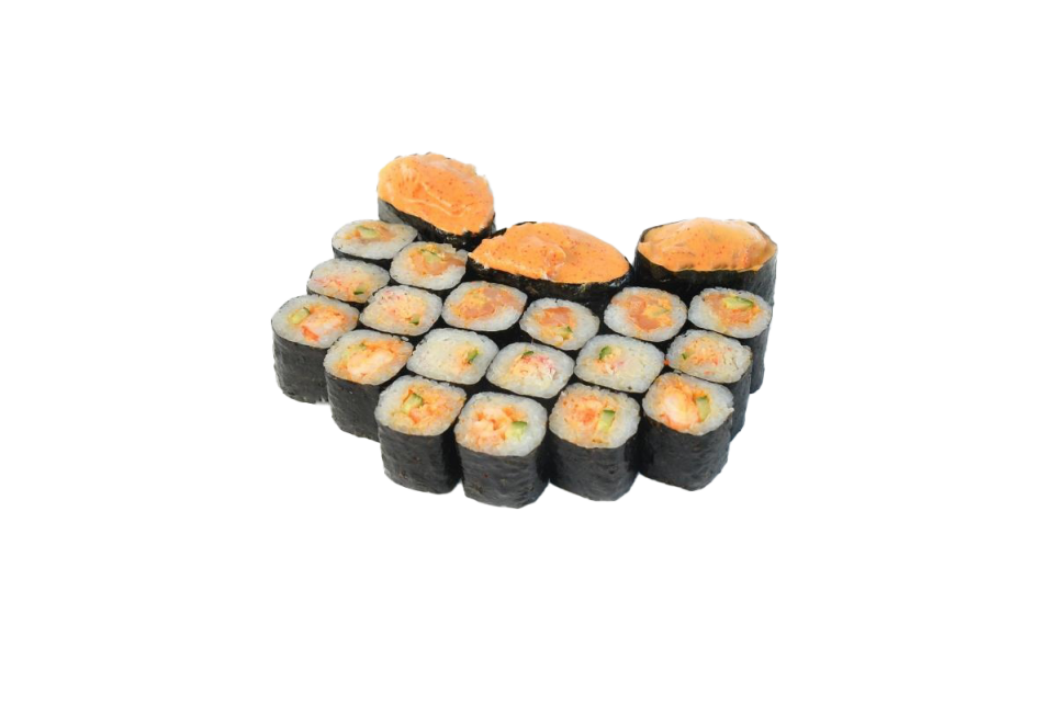 Острые с лососем - 6, Острые с крабом - 6, Острые с креветкой - 6, Суши Лосось - 1, Краб - 1, Суши Креветка - 1Ингридиенты: