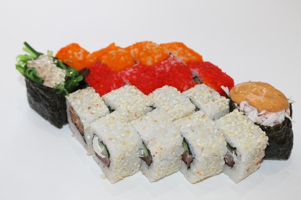 Ролл Калифорния - 4, Ролл Филадельфия спешл - 4, Ролл Лосось-Огурец - 4, Суши Спайси Краб - 1, Суши Чука - 1, Ролл За всё - 4Ингридиенты: