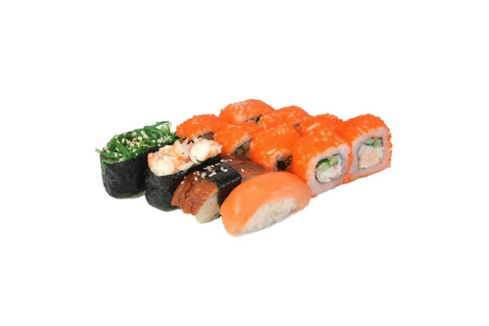 Рис, Нори, Лосось, Угорь, Креветка, Чука салат, Огурец, Масаго, Майонез, Имитация крабаТолько премиум продукты первой свежести и высшего качества