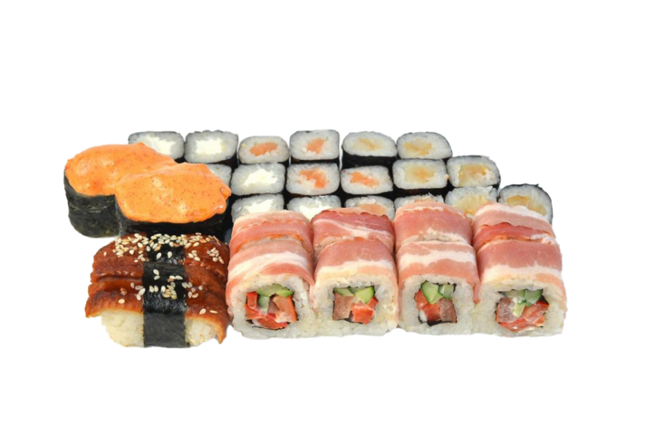 Ролл Эсколар - 6, Ролл Сыр - 6, Ролл Лосось - 6, По-русски - 8, Суши Спайси Лосось - 2, Суши Угорь - 2Ингридиенты:
